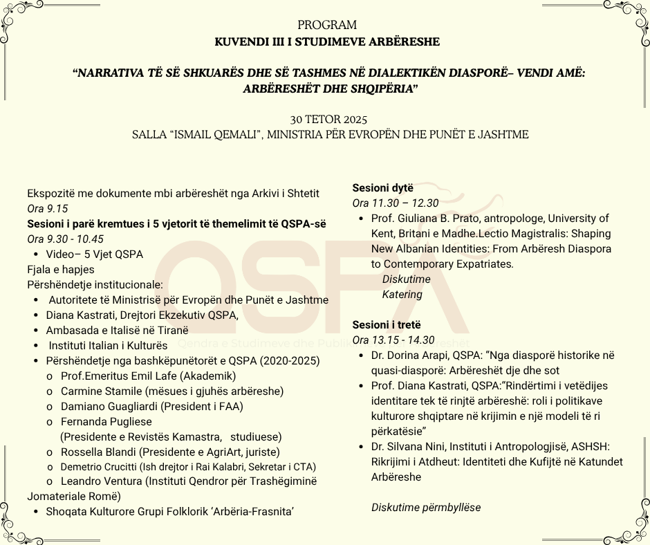Kuvendi III i Studimeve Arbëreshe, i cili mbahet çdo dy vjet, përbën ngjarjen më të rëndësishme studimore të organizuar nga Qendra e Studimeve dhe e Publikimeve për Arbëreshët (QSPA), që këtë vit përkon me 5-vjetorin e themelimit të Qendrës së Studimeve dhe Publikimeve për Arbëreshët (QSPA).